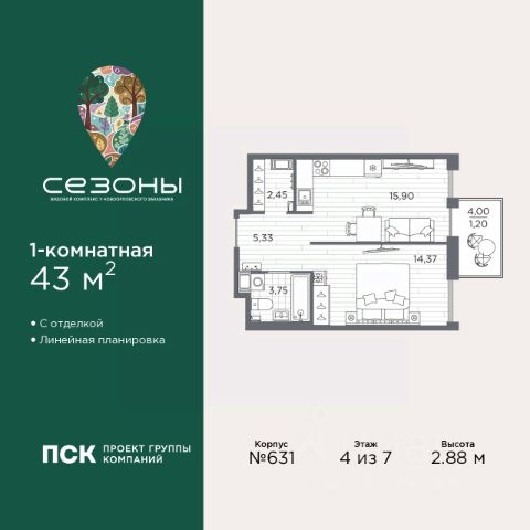 Просторная 1-комн. квартира с предчистовой отделкой в ЖК "Сезоны" на 2 этаже. Общая площадь: 37.38 кв.м., жилая: 14.24 кв.м., площадь просторной кухни-столовой: 15.37 кв.м. Все окна выходят на одну сторону. В квартире один совмещенный санузел. Высота потолков 2.88 м. Дом монолитный, многоподъездный, высотой 7 этажей. Квартира находится в 1-й секции в корпусе 611. На этаже 4 квартиры. В подъезде 1 грузовой лифт. Начало строительства - 4 квартал 2025 года. Окончание строительства - 2 квартал 2028 года. Оформление сделки по договору долевого участия. Видовой жилой комплекс "Сезоны" от ГК ПСК возводится в одном из самых востребованных и престижных районов Санкт-Петербурга - Приморском, рядом с Суздальским и Выборгским шоссе. Такое расположение обеспечивает удобный выезд в разные части города, сочетая городской комфорт с близостью к природе. Всего в 50 метрах находится природный заказник "Новоорловский" и речка Каменка, а в пешей доступности - Суздальские озёра. Приморский район отличается развитой социальной и транспортной инфраструктурой. Здесь расположены крупные торговые и деловые центры, современные спортивные объекты, медицинские учреждения, магазины, кафе и рестораны. Комплекс включает четыре корпуса, ввод которых в эксплуатацию запланирован на 2028 год. Проект и прилегающий микрорайон разработаны в соответствии с концепцией "15-минутного города", при которой вся необходимая инфраструктура находится в шаговой доступности. В ближайшем окружении - две школы, пять детских садов, магазины, кафе, салоны красоты, банковские отделения и пункты выдачи заказов. Также предусмотрены два четырёхъярусных паркинга с лифтами на 288 машиномест. О застройщике ГК ПСК - один из крупнейших девелоперов Санкт-Петербурга с более чем 18-летней историей. Компания реализует проекты во всех сегментах недвижимости - от премиальных жилых комплексов до масштабных кварталов комфорт-класса и апарт-отелей. По данным портала ЕРЗ.РФ, ПСК входит в ТОП-3 крупнейших застройщиков Санкт-Петербурга по объёму текущего строительства. Портфель компании превышает 3 млн кв. м жилой и коммерческой недвижимости. Все объекты сдаются строго в срок и отличаются высоким уровнем архитектурных и инженерных решений. #ZtoOST Продам 1-комнатную квартиру с евроремонтом в районе Приморский в Санкт-Петербурге.
