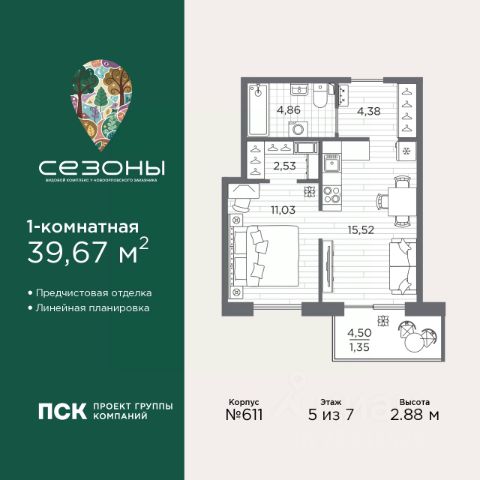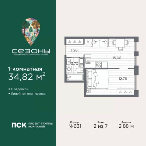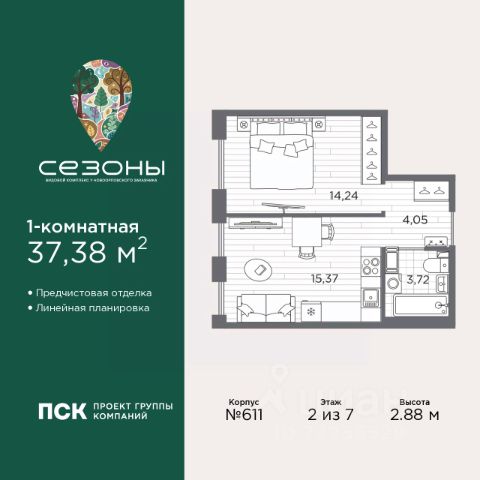 Продается однокомнатная квартира с предчистовой отделкой в ЖК "Сезоны" на 2 этаже. Общая площадь: 37.38 кв.м., жилая: 14.24 кв.м., площадь просторной кухни-столовой: 15.37 кв.м. Все окна выходят на одну сторону. В квартире один совмещенный санузел. Высота потолков 2.88 м. Дом монолитный, многоподъездный, высотой 7 этажей. Квартира находится в 1-й секции в корпусе 611. На этаже 4 квартиры. В подъезде 1 грузовой лифт. Начало строительства - 4 квартал 2025 года. Окончание строительства - 2 квартал 2028 года. Оформление сделки по договору долевого участия. Видовой жилой комплекс "Сезоны" от ГК ПСК возводится в одном из самых востребованных и престижных районов Санкт-Петербурга - Приморском, рядом с Суздальским и Выборгским шоссе. Такое расположение обеспечивает удобный выезд в разные части города, сочетая городской комфорт с близостью к природе. Всего в 50 метрах находится природный заказник "Новоорловский" и речка Каменка, а в пешей доступности - Суздальские озёра. Приморский район отличается развитой социальной и транспортной инфраструктурой. Здесь расположены крупные торговые и деловые центры, современные спортивные объекты, медицинские учреждения, магазины, кафе и рестораны. Комплекс включает четыре корпуса, ввод которых в эксплуатацию запланирован на 2028 год. Проект и прилегающий микрорайон разработаны в соответствии с концепцией "15-минутного города", при которой вся необходимая инфраструктура находится в шаговой доступности. В ближайшем окружении - две школы, пять детских садов, магазины, кафе, салоны красоты, банковские отделения и пункты выдачи заказов. Также предусмотрены два четырёхъярусных паркинга с лифтами на 288 машиномест. О застройщике ГК ПСК - один из крупнейших девелоперов Санкт-Петербурга с более чем 18-летней историей. Компания реализует проекты во всех сегментах недвижимости - от премиальных жилых комплексов до масштабных кварталов комфорт-класса и апарт-отелей. По данным портала ЕРЗ.РФ, ПСК входит в ТОП-3 крупнейших застройщиков Санкт-Петербурга по объёму текущего строительства. Портфель компании превышает 3 млн кв. м жилой и коммерческой недвижимости. Все объекты сдаются строго в срок и отличаются высоким уровнем архитектурных и инженерных решений. #ZTo0s7 Продам 1-комнатную квартиру с евроремонтом в районе Приморский в Санкт-Петербурге.