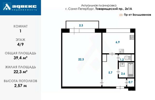 Продается 1-комнатная квартира в ЖК "Дыбенко Парк" на 9 этаже. Общая площадь составляет 36.00 кв. м. Квартира с чистовой отделкой. Жилой комплекс располагается по адресу Санкт-Петербург, проспект Товарищеский. Новый проект комфорт плюс-класса, расположенный в пешей доступности от станции метро "Улица Дыбенко". В проекте предусмотрен широкий выбор планировочных решений: от функциональных студий до просторных двух - и трехкомнатных квартир с мастер-спальнями и балконами. Также доступны лоты с двумя окнами на кухне/в спальне. Все квартиры сдаются с чистовой отделкой в двух цветовых решениях - Comfort Stone и Comfort Wood. Развитая социальная инфраструктура, налаженная транспортная система, близость к паркам и торговым центрам - здесь созданы все условия для активной городской жизни. Возле дома появится отдельно стоящий 9-этажный паркинг на 331 машиноместо. Двор жилого комплекса будет закрытым. Центральное место благоустроенной территории займет детская зона, которая будет отделена от зоны отдыха и спортивной площадки зелеными насаждениями. Расположение: • 10 мин на авто до Октябрьской набережной; • 15 мин пешком до метро Улица Дыбенко; • 15 мин пешком до парка им.Есенина. • 15 мин на авто до Мега-Дыбенко; • 30 мин на авто до центра Санкт-Петербурга. Данная локация станет отличным выбором для семей с детьми. Рядом с "Дыбенко Парком" уже сейчас функционирует множество школ и детских садов, медицинских центров и магазинов. Дополнительно на первом этаже дома откроют детский сад на 65 мест и просторный кабинет врача общей практики. Дома оборудованы самыми современными инженерными системами и "Умным домом". Преимущества: • Высота потолков от 2,7м • Уникальные планировки с балконами; • Закрытая территория; • Система "Умный дом"; • Кладовые в подвале и на этаже; • Колясочная в парадной; • Видеонаблюдение в холлах, на первом этаже, в лифтах и в паркингах. Успейте приобрести квартиру на выгодных условиях! Чтобы узнать подробности, обращайтесь за консультацией по телефону. Продам 1-комнатную квартиру с евроремонтом на проспекте Товарищеский в Санкт-Петербурге.