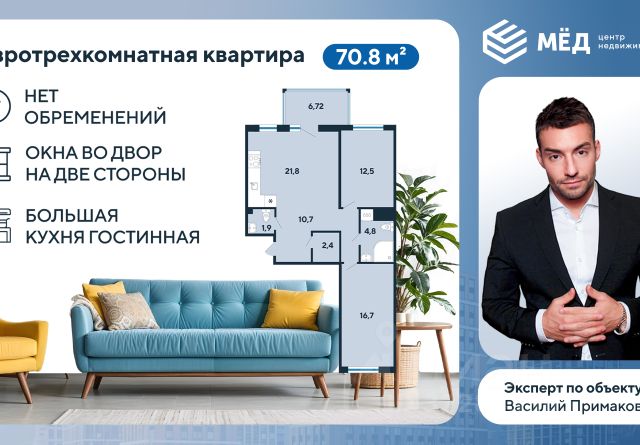 Евротрешка с кладовкой и паркингом в Петроградском районе. О квартире: - Общая площадь - 70,8 кв.м без учета балкона - Просторная кухня-гостиная - 21,8 кв.м - Изолированные спальни - 12,5 и 16,7 кв.м - Санузлы - 1,9 и 4,8 кв.м - Холл - 10,7 кв.м - Кладовая - 2,4 кв.м - Застекленный балкон - 6,72 кв.м - Высокий 9 этаж - Вид из окон во двор Продается двухсторонняя семейная квартира в новом заселенном доме. В квартире выполнена отделка white box: завершите ремонт по своему вкусу без лишних расходов. Выделено помещение под гардеробную/кладовую в квартире, в просторном холле разместится большая система хранения. Также вместе с квартирой продаются: машино-место в подземном паркинге и кладовое помещение 4,4 кв.м на -1 этаже дома. О доме: - ЖК Skandi Klubb 2020 г. постройки - Бизнес-класс - Материал стен - монолит - Высота потолков 3 м - На первом этаже кафе и пекарни, салоны красоты, супермаркеты Инфраструктура: - В пешей доступности детский сад 82, детский клуб, гимназии 67 и 70, университет ЛЭТИ. - В 5 минутах ходьбы фитнес-клубы, рестораны, ТРЦ, спа-салоны, бизнес-центры. - 10 минут пешком до Ботанического сада и Аптекарской набережной. - 10 минут пешком до станции метро Петроградская. - 12 минут на автомобиле до Невского проспекта. О сделке: - Прямая продажа - Никаких обременений - Ипотека возможна - Один взрослый собственник - Вся цена в договоре - Стоимости машино-места и кладовой под запрос Одобрение ипотеки, проведение сделки - бесплатно!