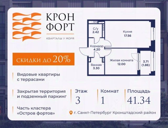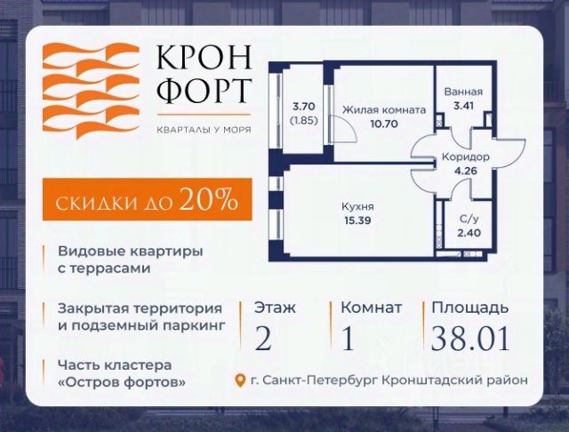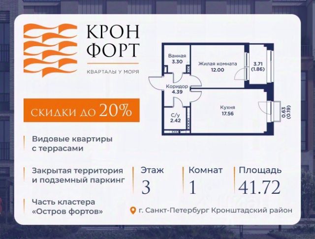 Стоимость квартиры указана со скидкой 20%. Скидка предоставляется при 100% оплате или несубсидированной ипотеке. Предлагается квартира площадью 46.45 кв.м в жилом комплексе "Кронфорт. Центральный" в Санкт-Петербурге (Кронштадт). Возможна покупка с использованием льготных и специальных ипотечных программ с государственной поддержкой. Высота потолков в квартирах — от 3 до 3,4 метров, окна увеличенного размера, есть варианты с эркерами, французскими балконами, лоджиями и террасами. Жилой квартал состоит из пяти четырехэтажных корпусов с закрытыми охраняемыми дворами, свободными от машин. Первые этажи формируют торговые променады в стиле пешеходных улиц исторической части Петербурга и Кронштадта. Внутренние пространства между корпусами — пешеходные зоны с уютными площадями. Архитектурный облик квартала разработан бюро "Проектная культура" и международной компанией Chapman Taylor. Инфраструктура комплекса включает: - Лицей с двумя бассейнами - Детский сад на 150 мест с бассейном и закрытой территорией - Веревочный парк - Игровые площадки для активного отдыха; - Кабинет врача общей практики. - Подземные паркинги с лифтами. - Мусоросборные камеры, индивидуальные кладовые. - Закрытые дворы с контролем доступа и видеонаблюдением. - Мультформатный стрит-ретейл с кафе и ресторанами. - Триатлон-центр и беговые/велодорожки. - Учебно-тренировочный комплекс для детей "Лагерь настоящих героев". Транспортная доступность обеспечивает удобный выезд на КАД (около 1-3 км), 2 минуты пешком до автобусной остановки "Лицей", 25 минут до Сестрорецка, 30 минут до "Лахта-центра", 50 минут до аэропорта "Пулково" и 60 минут до Московского вокзала. Для любителей моря доступен маршрут на "Метеоре" до центра Санкт-Петербурга. Отделка квартир предлагается как с готовой чистовой отделкой, так и со свободной планировкой без отделки для реализации индивидуальных дизайнерских решений. В третьем корпусе, продажи которого стартовали в марте 2025 года, доступны квартиры с просторными террасами, тремя балконами, кухнями-гостиными до 38 кв.м с окнами на две стороны, обеспечивающими панорамное освещение и виды. Если вам нужна помощь с оформлением ипотеки или дополнительная информация по комплексу и условиям покупки, обращайтесь в отдел продаж за консультацией. Купить 1-комнатную квартиру с лоджией в Кронштадте.