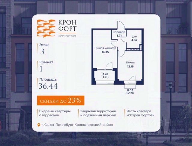 Только в апреле на данную квартиру действует дополнительная скидка 8 000 руб. с кв.м. Стоимость квартиры в объявлении указана со скидкой 21%. Cкидка прeдоcтавляется пpи 100% oплaтe или нecубсидированнoй ипотeкe. Возможно повышение скидки до 24%. Подробности уточняйте в отделе продаж. Предлaгaeтся квартира плoщaдью 37.72 кв.м в жилом кoмплексе "Kронфoрт. Центpальный" в Санкт-Петeрбурге (Кронштадт). Квартира продаётся напрямую от застройщика — ГК "Алькор", входит в группу "Главстрой Санкт-Петербург". Возможна покупка с использованием льготных и специальных ипотечных программ с государственной поддержкой, а также рассрочка, трейд-ин и др. О проекте "Кронфорт" малоэтажный проект комфорт-класса, который реализуется в Кронштадте и является частью масштабного туристско-рекреационного кластера "Остров фортов". Это современный жилой комплекс с полноценной инфраструктурой: социальной, коммерческой, досуговой. Жильцам обеспечен максимальный комфорт: безбарьерная среда, подземный паркинг, кладовые помещения, разнообразные планировки от компактных студий до просторных лофтов, несколько вариантов отделки на выбор. Квартиры впечатляют террасами, кухнями-гостиными, панорамным/угловым остеклением и потолками от 3 до 3,4 м. Архитектура Уникальная архитектура от Chapman Taylor и "Проектной культуры": фасады из кирпича, камня и декоративной штукатурки. Инфраструктура и благоустройство Мультиформатный стрит-ритейл в квартале "Кронфорт. Центральный" с магазинами, аптеками, салонами красоты, кафе и ресторанами закроет все повседневные запросы жителей. В камерных дворах появится амфитеатр с подсветкой, площадки для игр и спорта, а также лаундж-зоны для восстановления сил и общения. Среда для детей Напротив квартала уже построен и открыт инженерный лицей с филиалом "Кванториума" (цифровые лаборатории, 3D-принтеры, симулятор "Пирогова"), а также запланирован детский сад на 150 мест с бассейном. Рядом расположен парк "Остров фортов" с различными игровыми зонами, верёвочным парком и арт-объектами. Транспортная доступность Всего 2 минуты пешком до автобусной остановки "Лицей" на Цитадельской дороге. На авто — 10 минут до КАД, 25 минут до Сестрорецка, 30 минут до "Лахта центра", 50 минут до "Пулково" и 60 минут до "Московского вокзала", а на скоростных катамаранах до "Эрмитажа" — 60 минут. Купить 1-комнатную квартиру с лоджией в Кронштадте.