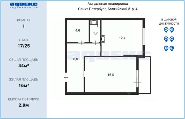 К продаже предлагается квартира формата 2-Евро в жилом комплексе Паруса. Современный дом 2018 года постройки. Просторная светлая квартира 44,6 м2 с большой кухней и комнатой. Продуманная и функциональная планировка: - Входной холл с местом для размещения мебели прихожей, шкафа. - В просторной кухне-гостиной 18,7 м2 с тремя окнами будет удобно не только готовить еду, но и принимать гостей. - В комнате 16,5 м2, примыкающей к кухне, можно организовать отдельную гостиную и дополнительное спальное место. - Большая по площади ванная 5,7 м2, в которой хватит места для постирочной зоны. - Окна квартиры выходят на запад. Открывается красивый вид на Финский залив и закаты. На первых этажах размещены коммерческие помещения: продуктовые магазины, пекарни, рестораны, кофейни, салоны красоты, аптека, пункты выдачи OZON и WB. Рядом с домом есть два небольших пляжа, а также благоустроенная набережная с прогулочной зоной и беседками, шезлонгами, качелями с навесом. Остановка автобуса находится в пределах 100 м от дома. Общественный транспорт ходит отлично, каждые 5-10 минут. Ближайшие станции метро — Ленинский проспект и Проспект Ветеранов. В ближайшем будущем откроется метро Юго-Западная на пересечении ул. Маршала Казакова и пр. Маршала Жукова. Транспортное сообщение обеспечено основными магистралями Красносельского района: Ленинский проспект, Петергофское шоссе и проспект Маршала Жукова. Жильцам дома Паруса доступна оперативная связь со всеми районами города за счет соседства с выездами на Западный скоростной диаметр и КАД. В квартире никто не прописан, все документы готовы, полная стоимость в договоре. Подходит под ипотеку. Звоните, записывайтесь на просмотр, обсудим все вопросы. 1-комнатная квартира на бульваре Балтийский в Санкт-Петербурге.