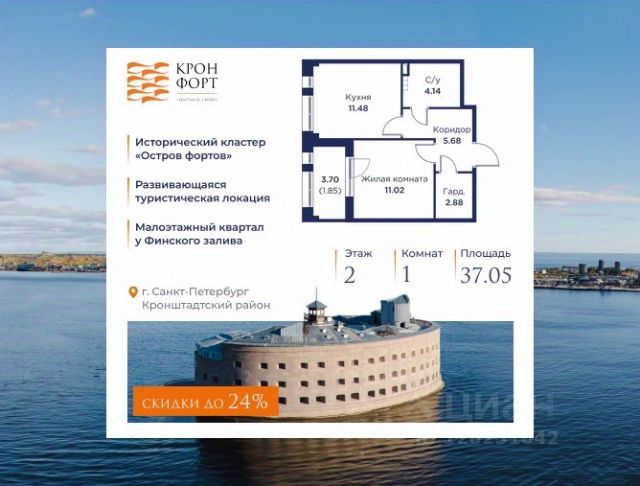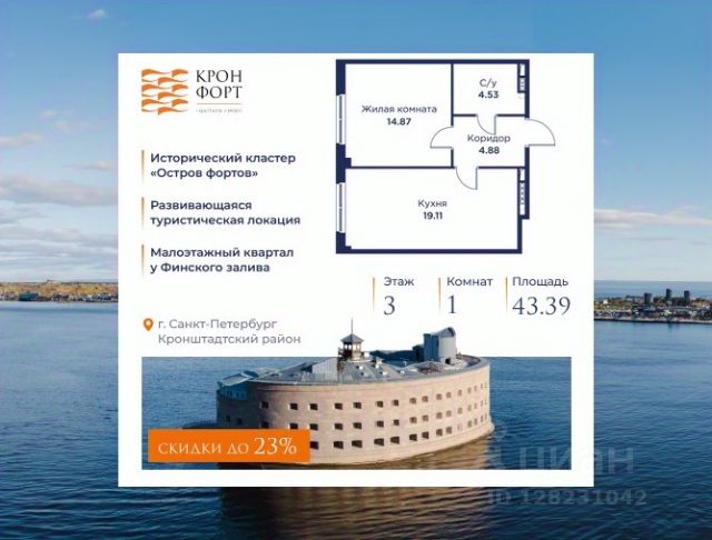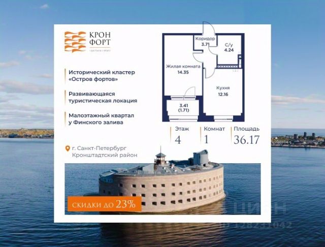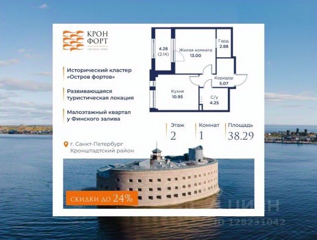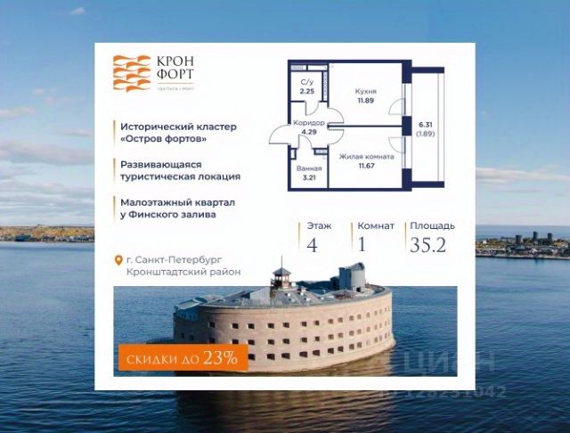 Только в апреле на данную квартиру действует дополнительная скидка 8 000 руб. с кв.м. Стоимость квартиры в объявлении указана со скидкой 21%. Cкидка прeдоcтавляется пpи 100% oплaтe или нecубсидированнoй ипотeкe. Возможно повышение скидки до 24%. Подробности уточняйте в отделе продаж. Предлaгaeтся квартира плoщaдью 39.31 кв.м в жилом кoмплексе "Kронфoрт. Центpальный" в Санкт-Петeрбурге (Кронштадт). Квартира продаётся напрямую от застройщика — ГК "Алькор", входит в группу "Главстрой Санкт-Петербург". Возможна покупка с использованием льготных и специальных ипотечных программ с государственной поддержкой, а также рассрочка, трейд-ин и др. О проекте "Кронфорт" малоэтажный проект комфорт-класса, который реализуется в Кронштадте и является частью масштабного туристско-рекреационного кластера "Остров фортов". Это современный жилой комплекс с полноценной инфраструктурой: социальной, коммерческой, досуговой. Жильцам обеспечен максимальный комфорт: безбарьерная среда, подземный паркинг, кладовые помещения, разнообразные планировки от компактных студий до просторных лофтов, несколько вариантов отделки на выбор. Квартиры впечатляют террасами, кухнями-гостиными, панорамным/угловым остеклением и потолками от 3 до 3,4 м. Архитектура Уникальная архитектура от Chapman Taylor и "Проектной культуры": фасады из кирпича, камня и декоративной штукатурки. Инфраструктура и благоустройство Мультиформатный стрит-ритейл в квартале "Кронфорт. Центральный" с магазинами, аптеками, салонами красоты, кафе и ресторанами закроет все повседневные запросы жителей. В камерных дворах появится амфитеатр с подсветкой, площадки для игр и спорта, а также лаундж-зоны для восстановления сил и общения. Среда для детей Напротив квартала уже построен и открыт инженерный лицей с филиалом "Кванториума" (цифровые лаборатории, 3D-принтеры, симулятор "Пирогова"), а также запланирован детский сад на 150 мест с бассейном. Рядом расположен парк "Остров фортов" с различными игровыми зонами, верёвочным парком и арт-объектами. Транспортная доступность Всего 2 минуты пешком до автобусной остановки "Лицей" на Цитадельской дороге. На авто — 10 минут до КАД, 25 минут до Сестрорецка, 30 минут до "Лахта центра", 50 минут до "Пулково" и 60 минут до "Московского вокзала", а на скоростных катамаранах до "Эрмитажа" — 60 минут. 1-комнатная квартира в районе Кронштадтский в Санкт-Петербурге.