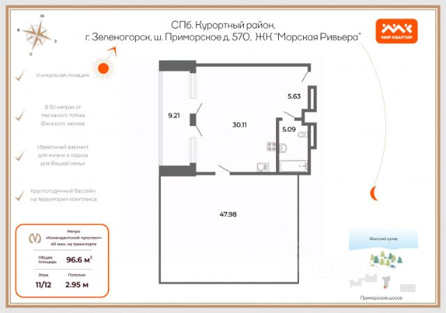 Функциональная однокомнатная квартира - Формат Light, которая подойдет для комфортного проживания небольшой семьи. Особенности лота: гардеробная потолки 3 м отделка White Box панорамные окна ИНДИВИДУАЛЬНЫЕ УСЛОВИЯ РАССРОЧКИ! ВЫГОДНАЯ ЦЕНА ПРИ 100% ОПЛАТЕ! Загородная жизнь с городским комфортом! Малоэтажный ЖК и небольшое количество квартир на этажах создают атмосферу приватной резиденции. В ЖК бизнес-класса Ranta Residence нет студий: все квартиры имеют площадь от 36 м² до 99 м². Прописка Санкт-Петербург. БЛАГОУСТРОЙСТВО Закрытая охраняемая территория, современный ландшафтный дизайн от студии L.Buro, натуральные материалы в обустройстве, а также резидентам ЖК будут доступны: теннисный корт на крыше паркинга; коворкинг под открытым небом; финский павильон с живым очагом и шезлонгами; павильон с барбекю; гамаки, скамейки и лежаки; спортивные и детские площадки; три прогулочные аллеи, амфитеатр; водный арт-объект; сад скульптур и пряных трав. ИНФРАСТРУКТУРА Мы создаём атмосферу закрытого клуба и интересного комьюнити, только для резидентов ЖК будут доступны: Бэби-клуб с детской комнатой и заботливой няней; Спортивный зал с тренажерами; Зал для йоги и стретчинга; Коворкинг; Кофейня; Собственный детский сад и начальная школа. В пешей доступности расположены: ТЦ Курортный Продуктовые магазины Перекресток и Пятерочка Аптека Кафе быстрого питания 4 школы и 3 детских сада Взрослая и детская поликлиники Рестораны и парки. ЛОКАЦИЯ ЖК бизнес-класса Ranta Residence расположен в экологически чистом Курортном районе Санкт-Петербурга, занимает участок площадью 5,4 Га по адресу: г. Санкт-Петербург, г. Зеленогорск, ул. Кривоносовская 57Д. ЖК Ranta Residence граничит с лесным массивом, также поблизости находятся: Государственный природный заказник "Озеро Щучье"; Золотой пляж; Комаровский берег; Зеленогорский парк культуры и отдыха; Горнолыжный курорт Пухтолова гора всего в 15 минутах на автомобиле . Съезда на ЗСД находится в 18 км, до ближайшей станции метро Беговая путь на автомобиле займет в среднем 50 минут, а до центра Санкт-Петербурга путь составит в среднем 60 минут. От ЖК Ranta Residence до центра Санкт-Петербурга около 60 км (по Зеленогорскому или Приморскому шоссе — они идут параллельно). До "Лахта-центра" 45 км и 45 минут в пути. В 15 минутах от ЖК на Вокзале Зеленогорск можно сесть на Ласточку, которая за 55 минут доезжает до Финляндского вокзала, там же есть автобусная остановка, от которой можно доехать к станциям метро Беговая и Черная речка" - этот путь займёт около 1,5 часа. Хотите узнать подробности? Звоните в Отдел продаж, наши специалисты ответят на все интересующие вас вопросы! #Зеленогорск, #Курортный район, просторная планировка, #малоэтажный, закрытый охраняемый двор, #бизнес-класс, панорамные окна, потолки 3 метра. Продам 1-комнатную квартиру в районе Курортный в Санкт-Петербурге.