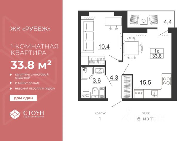 Цена действует при 100% оплате и на определенные ипотечные программы. Подробности — в отделе продаж по телефону. Продается 1-комнатная квартира в ЖК "Октябрьская набережная" на 17 этаже. Общая площадь составляет 33.30 кв. м. Квартира с чистовой отделкой . Жилой комплекс "Октябрьская набережная" располагается по адресу Санкт-Петербург, Невский. Октябрьская набережная - жилой комплекс на берегу Невы, который отличается живописными видами и удобным местоположением: в окрестностях ЖК есть всё необходимое для комфортной жизни. Расположение: • 2 минуты пешком до набережной Невы; • 7 минут до станции метро "Улица Дыбенко" на автомобиле; • 8 минут до Большого Обуховского моста на автомобиле; • 15 минут до ТРК "Лондон Молл" на автомобиле. Вход в парадные расположен на уровне земли и создает доступную среду. На цокольном этаже находятся кладовые. Во всех парадных расположены колясочные, рядом с ними - велопарковки. В зелёных и облагороженных дворах есть всё и для семей с детьми: тематические площадки, детский сад и даже школа. Комфортная среда для питомцев - еще одно преимущество: рядом с домами находится площадка для выгула собак. Для удобства автомобилистов на территории комплекса устроены крытые паркинги с безопасными охраняемыми выездами и большим количеством машино-мест. В пешей доступности расположены супермаркеты, кафе, парикмахерские, отделения банков. Преимущества ЖК: • Особенная локация. Живописные виды из квартир на Неву и променад для прогулок • На территории уже работают детский сад и школа, предусмотрены современные игровые площадки и безбарьерная среда. • Комфортная среда для жизни. Магазины, кафе и сервисы внутри жилого квартала. • Отличная транспортная доступность. Рядом выезд на КАД и остановки общественного. транспорта; метро "Ломоносовская" и "Улица Дыбенко" в 10 минутах на авто. • Идеально для жителей с питомцами. На территории появится площадка для выгула собак. Успейте приобрести квартиру на выгодных условиях! Чтобы узнать подробности, обращайтесь за консультацией по телефону.