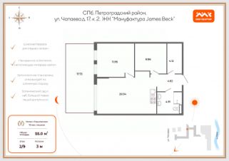 Квартира с одной спальней в комплексе "Сампсониевский 32" от LEGENDA на 2 этаже. -Общая площадь: 51.68 кв.м. -Жилая: 11.56 кв.м. -Площадь просторной кухни-столовой: 17.47 кв.м. -Высота потолков 2.7 м. Все окна выходят на одну сторону. В квартире один раздельный санузел. ЖК "Сампсониевский, 32" квартал бизнес-класса в Выборгском районе Санкт-Петербурга недалеко от набережной Большой Невки и Петроградской стороны. Отличают комплекс каскадные фасады с большой площадью остекления, видовые квартиры с террасами. Современные инженерные и технические решения, повышающие качество жизни TechnoBox включают в себя: стационарный и удаленный контроль дома, систему Air Design, обеспечивающую чистый воздух без лишнего шума, мультисервисную сеть, объединяющую коммуникационные системы. Квартиры сдаются с предчистовой отделкой: выровнены пол и стены, проведена электрика, предусмотрена шумоизоляция, встроенная система вентиляции. В каждой квартире установлена взломостойкая входная дверь, окна со специальным термоизолированным алюминиевым профилем. В ЖК "Сампсониевский, 32" много вариантов планировок: квартиры с террасой, мастер-спальней, ванной комнатой с окном, гардеробной комнатой. Двор закрыт от транспорта, здесь будут зоны с дизайнерским оформлением для игр и отдыха. Срок сдачи 4 квартал 2026 года. В отапливаемом подземном паркинге 298 мест, спуститься туда можно на лифте из своей квартиры. Комплекс находится на границе крупных районов, рядом с набережными, которые ведут в Приморский, Калининский и Центральный районы, а через Сампсониевский, Гренадёрский и Кантемировский мосты можно попасть в Петроградский район. До станции метро "Выборгская" 900 м, до станции метро "Петроградская" 2,6 км. Финляндский вокзал находится в 2,5 км от ЖК, а Западный скоростной диаметр (ЗСД) в 10 км. Рядом с ЖК находится несколько гимназий, общеобразовательных школ и детских садов. Здесь много медицинских учреждений, кафе, ресторанов, торговых центров, гипермаркетов. Меньше чем в 1 км от ЖК Сампсониевский и Выборгский сады, а в 2 км находится Ботанический сад, набережная реки Карповки с качелями и зонами отдыха у воды.