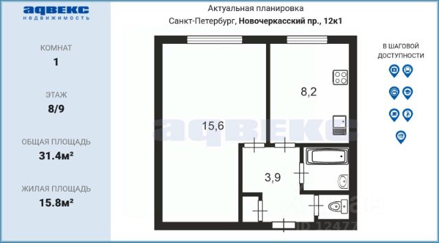 Код объекта: 1869757. Продается уютная, однокомнатная квартира в самом центре Красногвардейского р-на. Прекрасная локация, всего в 9-ти минутах спокойным шагом от станции Метро "Новочеркасская" Информация по КВАРТИРЕ: - Квартира с хорошим косметическим ремонтов! - Просторная кухня площадью 8м² позволит вам спокойно разместить любую технику - Комната светлая и уютная 15.6 м² дает возможность разделить на зоны для спального и рабочего места. - Раздельный санузел. - в просторном коридоре имеются встроенные удобные места для хранения - мебель и техника по договоренности остается в квартире Информация по дому и инфраструктуре: Девятиэтажный панельный жилой дом серии 1-ЛГ606В-7 (1966 - 1973 годы) модификации со встроенными помещениями для общественного использования на 1-м этаже. - дом радует ухоженной придомовой территорией с парковочными местами. - окна квартиры выходят во двор на тихий скверик. - удачная локация с уже сформированной инфраструктурой в полном ассортименте: школы, детские сады, поликлиники, магазины, рестораны, спортивные клубы, бассейны, детские площадки и больницы! на первом этаже дома уже есть : "Петербургские аптеки" Магазин "Фикс-прайс" Сбербанк ООО "Петербурггаз" Универсам "Пятёрочка" OZON - в пешей доступности замечательные прогулочные зоны, для любителей спорта современные тренажерные площадки. - в паре минут спокойной ходьбы "Малоохтинский парк" для живописных прогулок. - всего 5 минут на транспорте до ст. метро Площадь Александра Невского! Информация по документам: - один взрослый собственник, будет присутствовать на сделке. Звоните и записывайтесь на просмотр в удобное для вас время! Продается 1-комнатная квартира на проспекте Новочеркасский в Санкт-Петербурге.
