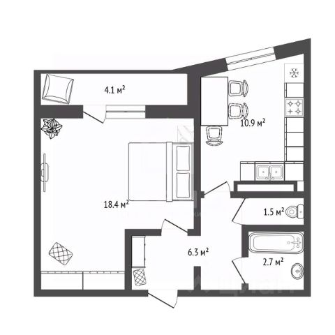 - 1 большая, изолированная комната с зонированием 18,1 кв.м,