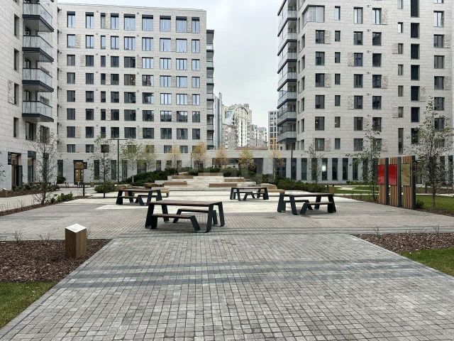 Внутренний двор включает детские и спортивные площадки, зоны отдыха и прогулочные аллеи, создавая комфортные условия для жителей