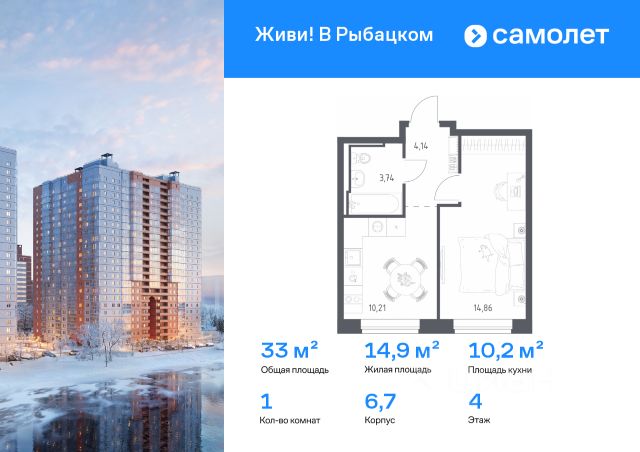 Строим кварталы для жизни с заботой о будущем. Предлагается 1-комнатная квартира комфорт-класса 39,17 кв.м в корпусе 6,7 на 13 этаже, в ЖК "Живи! В Рыбацком" Квартира без отделки. Доступность опции "отделка" и возможность комплектации мебелью и декором уточняйте у застройщика. Приобрести квартиру возможно по специальным акциям от застройщика, с текущими условиями акций можно ознакомиться в блоке "Акций". Цена динамическая и может отличаться, уточняйте актуальность у застройщика. Квартал "Живи! В Рыбацком" в Невском районе Санкт-Петербурга расположен рядом с рекой Славянкой и парком. Всего 20 минут пешей прогулки — и вы у метро "Рыбацкое". Автомобилисты будут добираться до КАДа за десять минут. В квартале работают два детских сада, школа и кабинет врача. На первых этажах зданий открыты магазины, кафе и салоны красоты. Во дворе — зеленые бульвары, воркаут-площадка, спортивный и игровой кластеры. Для машин — подземный паркинг. Кирпично-монолитные дома с каменной облицовкой — воплощение долговечности и тепла. Есть в квартале и камерный 30-й корпус, в нем восемь этажей, 70 квартир и приватный двор-парк. В сквозных парадных — безбарьерная среда, помещения для хранения колясок и велосипедов и система видеонаблюдения. 1-комнатная квартира в округе Рыбацкое в Санкт-Петербурге.