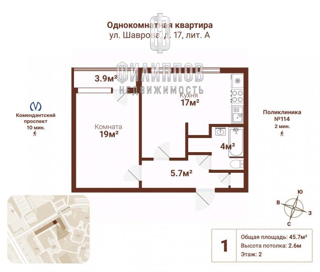 1-комнатная квартира с кухней-гостиной 17 м у метро Комендантский проспект БЕЗ КОМИССИИ для покупателя Ипотечное сопровождение- бесплатно Функциональная и светлая квартира с продуманной планировкой: кухня-гостиная - 17 м изолированная комната - 19 м В квартире выполнен качественный современный ремонт с использованием практичных и долговечных материалов: на полу - европейская паркетная доска и керамогранит. Квартира полностью готова к проживанию - можно заехать и жить без дополнительных вложений. Мебель и техника остаются новому собственнику - отличный вариант как для собственного проживания, так и для инвестиций под аренду. Окна выходят в тихий зелёный двор. Комфортный 2 этаж - оптимальный баланс приватности и удобства. Дом 1ЛГ-504Д - надёжная панельная серия с удобными изолированными планировками и хорошей шумо- и теплоизоляцией. Локация, которая экономит время 10 минут пешком до метро "Комендантский проспект" 15 минут пешком до Юнтоловского заказника - прогулки и спорт на свежем воздухе 5 минут на автомобиле до ЗСД В соседнем здании - поликлиника и школа. В шаговой доступности: магазины, кафе, салоны красоты, детские сады и всё необходимое для комфортной жизни. Документы Один взрослый собственник Без обременений Материнский капитал не использовался Полная юридическая чистота Оперативный выход на сделку Звоните и записывайтесь на просмотр - покажу в удобное для вас время. Лот:10.