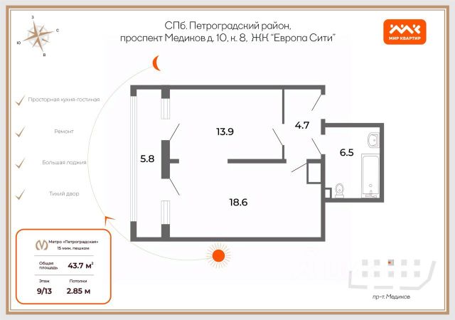 Арт. 119217445 Продаётся 2-евро планировки квартира в ЖК "Европа Сити" в престижном комплексе бизнес-класса от ЛСР. 2-евро, это удобная и современная планировка. Окна обращены на юг, в квартире установлен кондиционер. Пространство организовано максимально рационально: большая кухня-гостиная позволяет с комфортом разместить и обеденную зону, и зону отдыха. Просторная лоджия с выходом из гостиной и спальной комнаты. Отличное состояние ремонта, квартира готова для проживания. Корпус, в котором находится квартира, расположен в глубине территории комплекса, что гарантирует полное отсутствие шума с проспекта Медиков. Территория дома огорожена, в доме работает консьерж и круглосуточная охрана, которая обеспечивает безопасность и комфорт жильцов. На территории комплекса есть детский сад. Для автомобиля инфраструктурой комплекса предусмотрен подземный паркинг. В шаговой доступности множество ресторанов, магазинов, ТЦ "Риверхаус", станция метро "Петроградская", Лопухинский сад, набережная реки Большая Невка и Ботанический сад. Один взрослый собственник! Просмотры по предварительной договоренности. Звоните! Предлагаем ПРЕМИАЛЬНОЕ обслуживание для требовательных клиентов. Оперативно организуем просмотр, предоставим полную информацию по объекту. 20 лет работы с требовательными клиентами подготовили нас к решению ВАШИХ сложных задач. Будем рады знакомству! Ул. Рубинштейна, д.8. Купить 1-комнатную квартиру на проспекте Медиков в Санкт-Петербурге.
