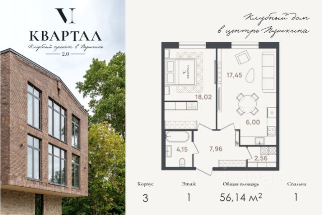 Уютная квартира 54,63 кв.м с отдельной спальней 18 кв.м и кухней-гостиной 23,5 кв.м, а также постирочной и просторной ванной комнатой. "VI Квартал" клубный проект, состоящий из четырех трехэтажных корпусов, рассчитан на 76 квартир и 98 машиномест в подземном паркинге. "VI Квартал" расположен в городе Пушкин, на ул. Новая, 20, в шаговой доступности от Екатерининского дворца. Комплекс предусматривает квартиры от 54 до 160 м2 с просторными планировками от 1 до 3 спален, с панорамными окнами и высокими потолками от 3 до 3,8 м. Особое место в проекте занимает детский сад с бассейном на 105 мест для детей от 3-х до 7-ми лет. На территории детского сада запроектированы игровые зоны, физкультурные площадки с резиновым покрытием, зеленые насаждения и теневые навесы. На территории самого комплекса предусмотрены прогулочные зоны, детские и игровые площадки. Безопасность обеспечивает закрытая территория, пункт охраны, консьерж-сервис. Срок сдачи 2 кв.2025г, рассрочка 10%. Купить 1-комнатную квартиру в микрорайоне Пушкин в Санкт-Петербурге.