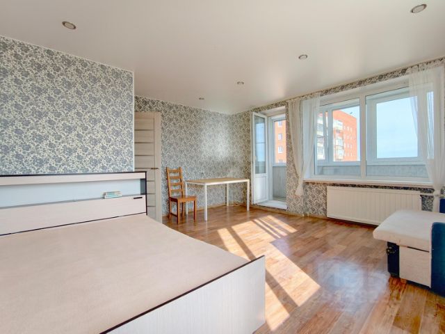 Квартира аккуратная, ухоженная, в хорошем жилом состоянии. Светлая комната, отдельная кухня, большая застеклённая лоджия, много естественного света. По фото видно, что квартира воспринимается просторной и воздушной: чистая отделка, нейтральные тона, хороший уровень готовности для личного проживания или сдачи в аренду.