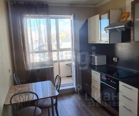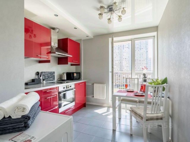 На кухне установлен встроенный кухонный гарнитур на 12 модулей, бытовая техника (полноразмерный холодильник, индукционная варочная поверхность, духовой шкаф, вытяжка, стиральная машина, микроволновая печь), стеклянный стол с 3-мя стульями, этажерка. Из кухни выход на застекленную лоджию, с которой открывается вид на двор. Окна выходят на восток.