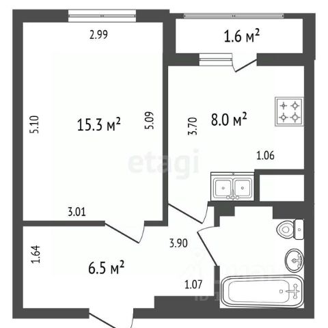 Общая площадь квартиры 35,7 кв.м: комната 17,2 кв.м., кухня 9 кв.м., коридор 6,5 кв.м., санузел 3,3 кв.м., Высота потолков 2,6 м.