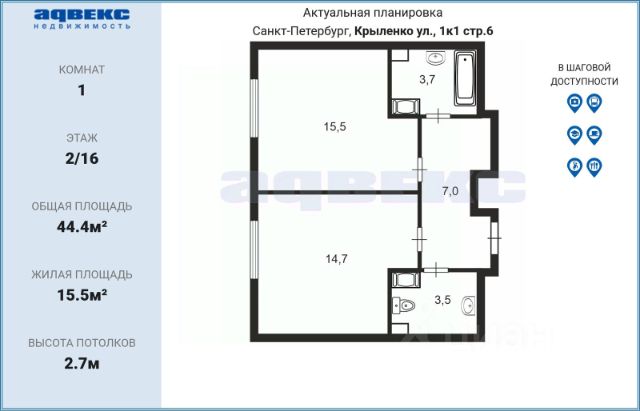 Продаются 1-комнатные апартаменты в сданном доме (Крыленко, 14с3 (Дом 16)), срок сдачи: IV-кв. 2023, общей площадью 39.5 кв.м., на 2 этаже. В стоимость входит полная чистовая отделка. Приобрести апартамент возможно в ипотеку или в рассрочку до окончания строительства (для 2 корпуса). Ипотека предоставляется Сбербанком, ВТБ, Совкомбанком и другими. Жилой комплекс "WINGS" строится на на пересечении оживленного Дальневосточного проспекта и улицы Крыленко. Рядом метро "Улица Дыбенко". Дорога пешком займет примерно двадцать минут. На автобусе или трамвае до метро "Улица Дыбенко" и "Проспект Большевиков" можно доехать за 10 минут. Для автомобилистов рядом находятся Дальневосточный проспект и Октябрьская набережная, по которым возможно быстро добраться до центра города и других районов Петербурга. Выезд на КАД находится в 2 километрах от дома. Первые этажи отданы под коммерческие помещения и службы быта, которыми будут пользоваться жильцы дома. При входе в дом расположится зона ресепшн с портье и охрана. Здание спроектировано с учетом потребностей людей с ограниченными возможностями. Продам 1-комнатную квартиру на улице Крыленко в Санкт-Петербурге.