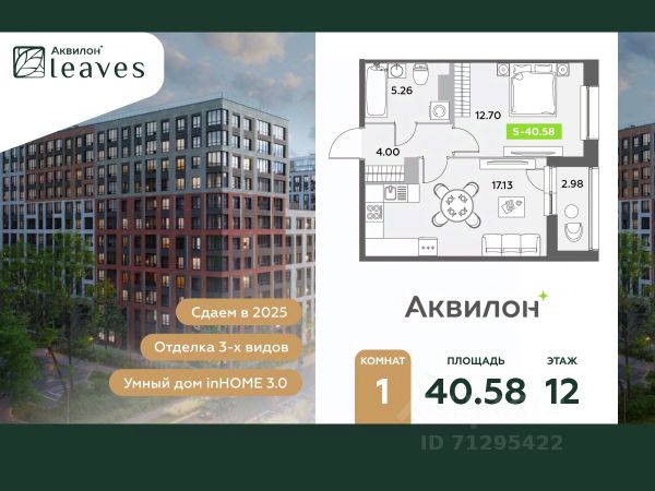 Купи квартиру в ЖК "Аквилон Leaves"! Отделка В квартире выполнена предчистовая отделка WhiteBox +Возможен дозаказ отделки в любом из 3 цветов: SAND, TERRA, GRAPHITE Отделка входит в стоимость квартиры в ДДУ ЖК "Аквилон Leaves" Жилой комплекс класса бизнес-лайт "Аквилон Leaves" воплощает идеальную синергию природы, технологий и дизайна. В одном из самых престижных районов Санкт-Петербурга мы создаем функциональную жилую среду, которая позволит максимально быстро и удобно решать бытовые вопросы, сохраняя ценное время для семьи и любимых занятий. -Малошумные лифты -Сквозные парадные -Светопрозрачные входные группы -Увеличенная высота первого этажа -Безбарьерная среда -Подземный паркинг Стандарты Группы Аквилон для вашей комфортной жизни Thermo-S экономия на коммунальных платежах за счет дополнительно утепленных стен, кровли и цоколя. Энергоэффективные окна с селективным покрытием и аргоновым заполнением Soundstop - дополнительная шумоизоляция внутренних перегородок и межэтажных перекрытий, шумозащитные окна, малошумные лифты Light-in - в квартирах устанавливаются широкоформатные окна, увеличены на 30%. Высота подоконников на уровне 60 см от пола. Vent-in - в каждой комнате есть клапаны индивидуальной вентиляции, которые обеспечивают приток свежего воздуха с улицы. inHOME умный дом в каждой квартире Интеллектуальная цифровая система, которая позволит дистанционно решать бытовые вопросы, управлять квартирой и экономить на оплате коммунальных услуг. В состав inHOME входят: IP-домофон, Face key, "умные" счетчики, датчики протечки, дистанционное отключение розеток, и т.д. Двор ваш личный парк Благоустройство двора от студии ландшафтного дизайна MEGABUDKA отсылает нас к образу зеленого листа. Современная архитектура гармонирует с окружающей средой, а экологические стандарты и "умные" системы обеспечивают ежедневный комфорт. -Зонирование на площадки для активного и спокойного отдыха. -Ландшафт с геопластикой и рельефом напоминает естественную красоту природных парков. -Всесезонные растения -Высаживаются взрослые деревья и кустарники Локация и инфраструктура Помимо разнообразной инфраструктуры, рядом с комплексом расположен Пулковский парк и сад "Дубовая роща". У жителей будут все возможности для отдыха на свежем воздухе. Велопрогулка, пробежка или летний пикник наслаждайтесь природой, не уезжая далеко загород. -10 мин. до м. Московская -15 мин. до м. Звездная -15 мин. до аэропорта Пулково -30 мин. до Невского пр. #zSfAAf Продам 1-комнатную квартиру на улице Среднерогатская в Санкт-Петербурге.