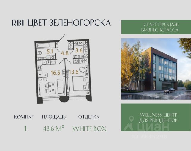 "Цвет Зеленогорска" — курорт блистательных людей от RBI на северном побережье Финского залива. Камерный дом бизнес-класса на 94 квартиры строится в Курортном районе Санкт-Петербурга в городе Зеленогорск на проспекте Ленина, 38. Отсюда рукой подать до Зеленогорского парка культуры и знаменитого Золотого пляжа с песчаными дюнами. До железнодорожной станции, куда за полчаса можно доехать на "Ласточке" от Финляндского вокзала, пешком 10 минут. Архитектура дома воплощает гениальную пластику модерна в современном прочтении. Изящный фасад визуально созвучен изгибу Жемчужного ручья, к которому плавно спускается приватный двор. В едином "волнообразном" корпусе — 4 секции по 4 этажа. В каждой — от 18 до 27 квартир: особая привилегия жить в комьюнити близких по духу людей. Квартирография камерная, но универсальная. Есть уютные студии и однокомнатные, куда курортным летом можно переезжать самим или сдавать в аренду и получать доход. Для любителей эстетики с нотками ностальгии — квартиры с французскими балконами и окном в ванной. Для тех, кто рассматривает квартиру как альтернативу загородному дому — большие двусторонние трёх- и четырёхкомнатные квартиры с кухней-гостиной и террасой для неспешных завтраков и уютных семейных вечеров. Лоты на типовых этажах — с потолками 2,99 м, на четвёртом этаже — 3,14 м. Все квартиры продаются с отделкой White Box. В приватном сквере у ручья среди малиновых спирей, душистых сиреней и ароматных хвойных деревьев легко сбежать от навязанных сценариев жизни, уделить внимание действительно важному и обрести подлинную гармонию. Во дворе появится деревянный амфитеатр для встреч, дискуссий и самовыражения, воздушная пергола с абажурами для уединённого общения, экологичные скамейки для чтения и созерцания природы, детская площадка с бревенчатыми лошадками, тоннелем-лазалкой, телескопом и другими игровыми элементами от Richter RUS. Внутри дома медитативный ритм загородной жизни продолжится в парадном лобби с волнообразными потолками, большими витражными окнами и светлыми лаунжами в окружении двух капельных водопадов. Здесь же появится витражная переговорная с кофепоинтом. На первом этаже только для резидентов дома оборудуют массажный кабинет, фитнес-зал с кардио- и силовыми тренажёрами, душевыми и индивидуальными шкафчиками, йога-рум для медитаций и современный хамам для глубокого расслабления через мягкий пар. Для жителей оборудуют подземный паркинг на 56 машиномест, 4 из них — с зарядкой для электромобилей. Перед центральной входной группой появится гостевая парковка на 28 м/м. Для хранения габаритных вещей — 82 кладовые, спуститься к ним можно на лифте с вашего жилого этажа. "Цвет Зеленогорска". Ваши краски курортной жизни Продам 1-комнатную квартиру на проспекте Ленина в городе Зеленогорск в Санкт-Петербурге.
