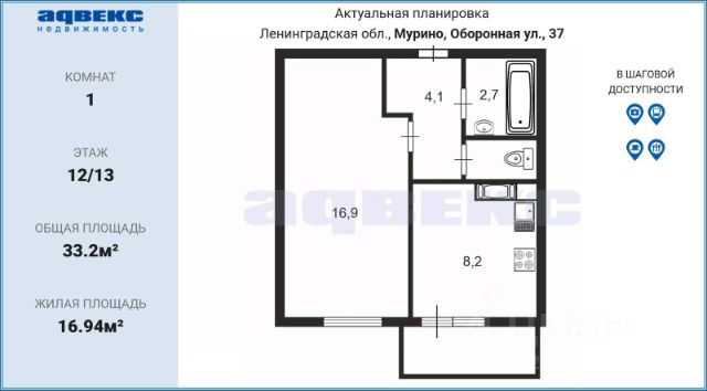 Продаётся 1-комнатная квартира в сданном доме (Графская, 6к1 (Корпус 3)), срок сдачи: III-кв. 2024, общей площадью 33.3 кв.м., на 9 этаже. Расположение, транспортная доступность Жилой комплекс "Лампо" расположен в городе Мурино, к северу от Санкт-Петербурга, на пересечении Графской и Екатерининской улиц. Статус города поселок Мурино получил в марте 2019 года. В пешей досягаемости, в двух километрах от ЖК, находится метро "Девяткино" и одноименная железнодорожная станция. Электричка доезжает до Финляндского вокзала за полчаса. В нескольких километрах от домов - новая развязка с КАД. Дорога на автомобиле до центра Санкт-Петербурга при отсутствии пробок займет около 45 минут, до международного аэропорта Пулково - менее часа. На автобусе или маршрутном такси можно доехать до метро, в пригороды и северные районы Санкт-Петербурга. Неподалеку протекает река Охта и начинается лесной массив. На автомобиле удобно выезжать в курортные поселки и Токсово, где находятся заповедник "Токсовские высоты" и охраняемый природный ландшафт озера Вероярви. Инфраструктура Внутренняя инфраструктура жилого комплекса Lampo включает детский сад на 100 мест, библиотеку на 400 единиц хранения, подземные паркинги и коммерческие объекты на первых этажах домов. В Мурино активно ведется жилищное строительство и создается новая инфраструктура. В шаговой доступности уже работают детские учебные заведения и развивающие центры, супермаркеты (SPAR, "Пятерочка", "Дикси", "Магнит"), отделения банков, кафе и другие объекты. Десять минут займет прогулка до фитнес-клуба, музыкальной студии, пятнадцать минут - до Муринского центра образования 2 или клиники "Семейный доктор". На автомобиле можно доехать до гипермаркетов "Лента" и "Ашан", торговых центров "Рубикон", "Мечта". На Гражданском проспекте, в получасе езды от ЖК, находится спорткомплекс Nova Arena с футбольными полями, площадками для игровых видов спорта, рестораном, SPA-студией и фитнес-клубом. Надежность застройщика Застройщик ЖК Lampo - ООО "Петрострой", работающее в строительной отрасли с 2008 года. География деятельности компании "Петрострой" - Санкт-Петербург, Ленинградская область и город Пермь. Главный офис находится в Санкт-Петербурге. В активе предприятия - реализованные и строящиеся жилые комплексы: "Ласточка", "Чистый ручей", "Тосно", "Первомайский", "Прибрежный", "Алфавит" и другие. Под реализацию проекта ЖК "Лампо" был выделен участок из сельскохозяйственных земель племенного завода "Ручьи". Разрешение на строительство было получено в июне 2018 года. Покупателям доступны ипотека (в том числе военная) и рассрочка на срок до двух лет. Архитектура Жилой комплекс Lampo - это четыре 16-19-этажных корпуса с пристроенным детским садом и подземными паркингами, расположенные на земельном участке 3,1 га. Название "Лампо" в переводе с финского языка означает "тепло": дома строятся из утепленных трехслойных панелей, произведенных на заводе "Финнград" на финском оборудовании с применением технологии бесшовных фасадов. Дв