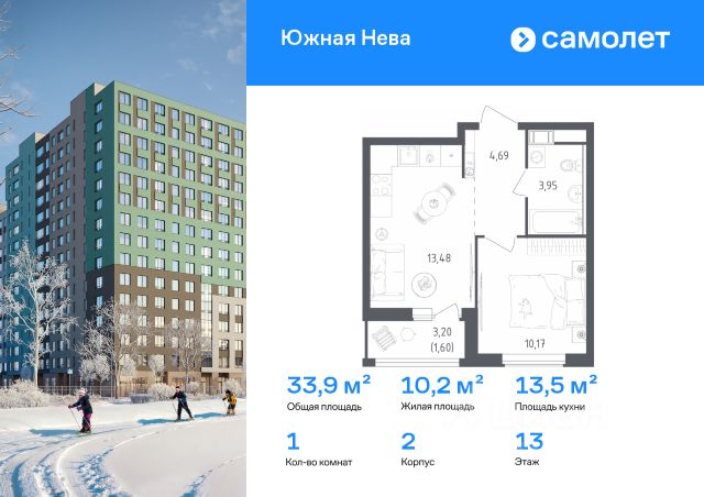 Строим кварталы для жизни с заботой о будущем. Предлагается 1-комнатная квартира комфорт-класса 38,28 кв.м в корпусе 2 на 4 этаже, в ЖК "Южная Нева" Квартира без отделки. Доступность опции "отделка" и возможность комплектации мебелью и декором уточняйте у застройщика. Приобрести квартиру возможно по специальным акциям от застройщика, с текущими условиями акций можно ознакомиться в блоке "Акций". Цена динамическая и может отличаться, уточняйте актуальность у застройщика. Спокойное течение Невы, монументальные арки Володарского моста и простор лесопарка создают атмосферу жилого комплекса "Южная Нева". До КАДа — всего 5 минут, до центра города — 30 минут на машине, а станция метро "Пролетарская" в 10 минутах. Для любителей природы рядом Невский лесопарк и "МЕГА Парк", где можно бегать, кататься на велосипеде или посетить веревочный парк. Для детей предусмотрены школа и 2 детских сада, а на первых этажах домов откроются салоны красоты, магазины и кафе. В шаговой доступности — фитнес-центр и торговые центры "МЕГА Дыбенко" и "Лондон Молл". Комплекс состоит из 11 монолитных домов высотой от 12 до 23 этажей с разноцветными фасадами и панорамными балконами. Двор украшают 7 мостов-навесов, а центральная аллея — собственная Нева. Здесь можно позагорать на лежаках или поиграть в шахматы, позаниматься на спортивной площадке или отвести ребенка в игровую зону на встречу с друзьями. В "Южной Неве" есть планировки с проходными кухнями-гостиными и гардеробными.
