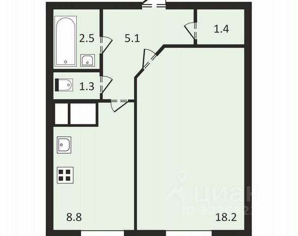Одно большое помещение площадью 25.8 м2.