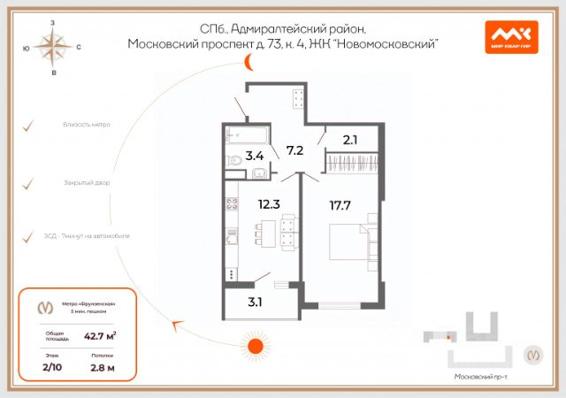 Арт. 125804591 Предлагается к продаже просторная 1-комнатная квартира площадью 42,7 кв. м в одном из лучших корпусов ЖК бизнес-класса "Новомосковский". Жилой комплекс расположен по адресу Московский проспект, д. 73, корп. 4, в непосредственной близости от ст. метро "Фрунзенская" 5 минут пешком!