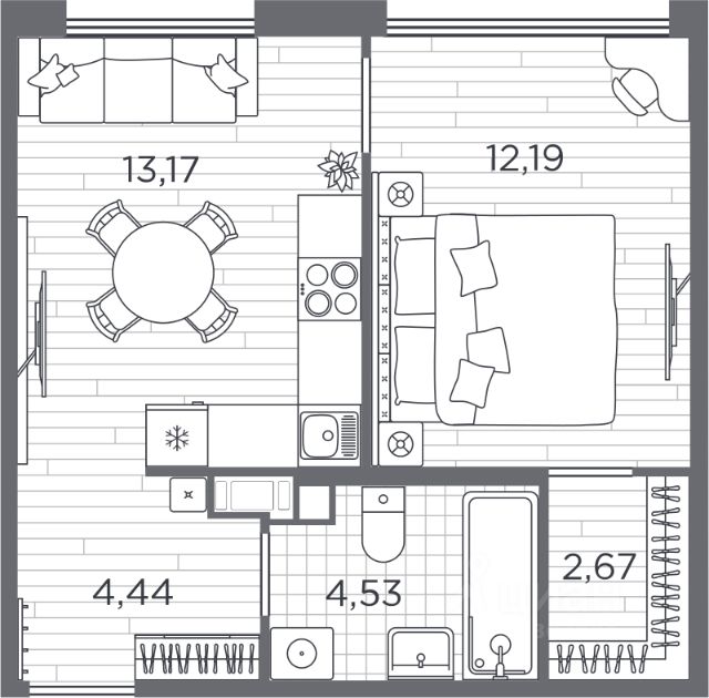 комната- 17,6 кв.м., с выходом на балкон - 3,6 кв.м.,