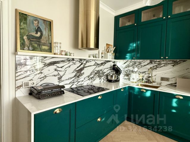 — Кухня: гарнитур с кварцевыми столешницами, встроенная техника (варочная панель, духовой шкаф, посудомоечная машина, микроволновая печь, холодильник), шкаф-витрина с подсветкой и держателями для бутылок, раздвижной обеденный стол вмещает до 10 персон.
