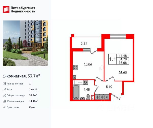 Внимание! Продается в прямой продаже просторная однокомнатная квартира с кухней-гостиной в ЖК "Юбилейный квартал" по адресу: улица Парашютная, дом 52 1. Квартира: - общая площадь 49 кв.м., комната 16,2 кв.м., кухня 14,2 кв.м., прихожая 11,5 кв.м., большая лоджия 3,6 кв.м.; - отдельная гардеробная/кладовка 2,1 кв.м.; раздельный санузел; - уютная лоджия с панорамными окнами; - окна выходят во двор на юго-запад; потолки 2,76 м.; - квартира находится в отдалении от лифтового холла; - в квартире никто не проживает. 2. Расположение: - до метро "Комендантский проспект" 15 минут на транспорте; - рядом с домом остановки общественного транспорта; - удобный выезд на КАД и ЗСД; - через дорогу прекрасное место для прогулок и отдыха Шуваловский лес. 3. Инфраструктура: - в пешей доступности: гипермаркеты (Лента, Лемана Про), магазины (ВкусВилл, Перекресток, Семишагофф, Дикси), сервисы ремонта, пекарни, химчистка, ветклиника, салоны красоты, фитнес клубы (Ambience, ReStretch, Fitness House); - в квартале есть пешеходные дорожки, установлены скамейки для отдыха, проведено озеленение; - в дворе: детская и спортивная площадки, детский сад 22, детский сад "Verona baby", центр развития ребенка "Детское Slovo" и "Робот клуб"; - рядом с домом школы 154 и 55, морской лицей. 4. Дом: - 2012 г.п. кирпично-монолитный, комфорт-класса, застройщик "Эталон"; - охраняемая территория, круглосуточное видеонаблюдение; - чистый ухоженный подъезд, домофон; - 14 этаж из 18; 2 быстрых бесшумных лифта; - отапливаемый подземный паркинг (всегда есть место для парковки в кармане по Парашютной с удобным выездом на КАД); - на этаже 4 квартиры. 5. Документы: - 1 взрослый собственник - можно избежать нотариальных расходов; - без обременений, никто не прописан; - прямая продажа - можно купить в ипотеку, применить субсидии и материнский капитал; - полная стоимость в договоре. Если Вы хотите жить в теплой просторной квартире и развитом микрорайоне - звоните, чтобы оперативно договориться о показе или узнать подробности, это ни к чему Вас не обязывает!) Продается 1-комнатная квартира на вторичном рынке на улице Парашютная в Санкт-Петербурге.