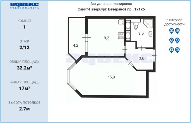 Продаётся отличная однокомнатная квартира с современным ремонтом и мебелью. Квартира светлая, солнечная и очень уютная. Окна выходят на восток — по утрам сюда заглядывает солнце, создавая приятное ощущение тепла и уюта, а днём в жаркую погоду в квартире сохраняется комфортная температура. Продуманная планировка: каждый квадратный метр использован максимально рационально. Дом комфорт-класса с красивыми фасадами и закрытой благоустроенной территорией без машин. Во дворе и по периметру дома камеры видеонаблюдения, круглосуточная охрана. Рядом с домом — всё необходимое для комфортной жизни: Магазины, пекарни, кофейни, банкоматы, барбершопы, салоны красоты, фитнес-зал, продуктовые магазины, пункты выдачи и многое другое. В доме есть подземная парковка. Также рядом расположены бесплатные и платные гостевые парковки. Отличная транспортная доступность: удобный выезд на КАД, дороги не загружены, рядом остановки общественного транспорта. Развитая инфраструктура: поблизости несколько детских садов, школы, бесплатных поликлиник. Тихие, приятные соседи. Район благоустроенный и зелёный — рядом несколько парков, набережная Финского залива и множество мест для прогулок и отдыха. Документы: Один взрослый собственник Без обременений Материнский капитал не использовался Полная стоимость в договоре Просмотры по договорённости — записывайтесь заранее! Успейте купить отличную квартиру для жизни, которая будет радовать вас каждый день. Купить 1-комнатную квартиру (вторичка) на проспекте Ветеранов в Санкт-Петербурге.