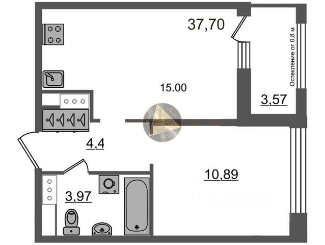 Общая 31,8 м кв + з/лоджия 3,6, комната 13,8, кухня 10,6, совм.санузел 3,4 (с ванной), прихожая 4,0. Высота потолков 2,75.