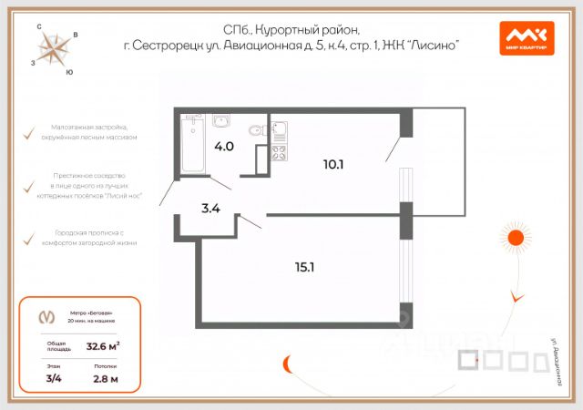 Они неразрывно связаны, поэтому опишу вместе. Курортный район, престижное соседство с элитным коттеджным посёлком "Лисий нос", неподалёку - благоустроенные пляжи Финского залива, экопарк, Сестрорецкий разлив, лесные массивы и посреди этого великолепия раскинулся наш город-парк.