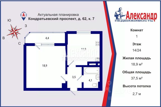 1704138 Продается однокомнатная квартира в Калининском районе Санкт-Петербурга, Кондратьевский проспект, дом 62 корпус 7, ЖК "Панорама". Общая площадь 37,5 кв.м, жилая площадь 18,9 кв.м, кухня 11 кв.м, совмещенный санузел с ванной - 4,1 кв.м, застекленный балкон 4,4 кв.м. Состояние квартиры - заходи и живи. Квартира находится на 14-ом этаже 24-х этажного кирпичного дома, 2014 года постройки, окнами на юг.. Чистая парадная с консьержем и закрытая охраняемая территория оснащены системой видеонаблюдения. Грузовой и пассажирский лифты. Домофон. Благодаря толстым, кирпичным стенам в доме хорошая звуко и тепло изоляция. На этаже всего пять квартир. Для автовладельцев предусмотрены места на территории, крытый паркинг и открытая огороженная парковка непосредственно за территорией ЖК. Жилищный комплекс комфорт класса "Панорама" расположен в районе с развитой инфраструктурой, где есть все необходимое для комфортной жизни: супермаркеты Магнит, Пятёрочка, Лента, пекарни, кофейни, парки, спортивные клубы и площадки, бассейны, детские сады, школы. Остановка автобуса в трех минутах пешком от дома. До метро Лесная на автобусе до 20 минут. У квартиры один совершеннолетний собственник. Никто не зарегистрирован. Обременений нет. При покупке материнский капитал не использовался. Подходит под ипотеку, поможем с одобрением. Свободная продажа. Предлагайте свою цену. Звоните, договоримся о просмотре. Купить 1-комнатную квартиру (вторичка) в жк Панорама в Санкт-Петербурге.