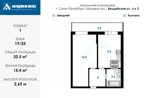 Однокомнатная квартира в жилом комплексе "Шушары-Парк", Вишерская улица, дом 24, стр. 1. Квартира расположена на 11 этаже 25-этажного дома. Общая площадь — 34,4 кв. м, жилая — 14 кв. м.