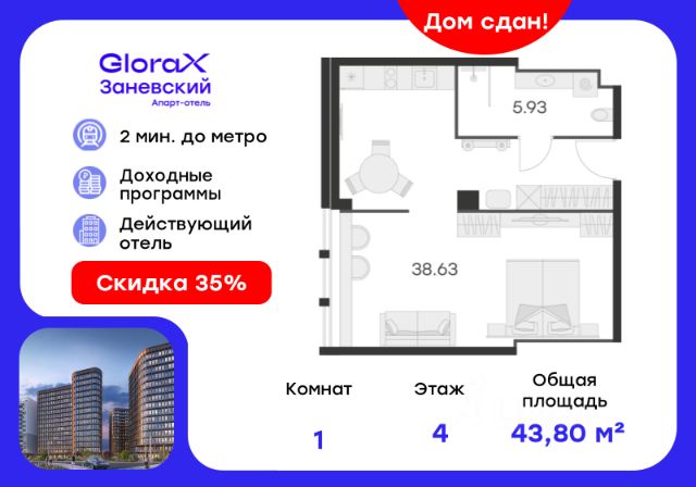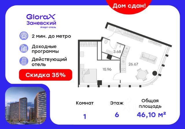 Продается 1-комн. апартамент на 14-м этаже в сданном Апарт-комплексе бизнес-класса "GloraX Заневский". Ключи сразу! Общая площадь лота составляет 46,30 кв. м, из которых 15,96 кв. м отведено под жилую. Номер апартамента - 1 439. Преимущества: - Полная чистовая отделка - Возможность покупки меблировка и техника - Вход по ключ-карте - Прачечная на 1 этаже - Возможность дозаказа отельного сервиса - Программы доходности - Летний бар и променад - Воркаут площадка - Pet-friendly Апартаменты "GloraX Заневский" - проект бизнес-класса с развитой инфраструктурой, удовлетворяющей все потребности самых взыскательных гостей. Располагается в одном из наиболее перспективных, районов Петербурга в 2х минутах от метро "Ладожская" и в 10 минутах от Невского проспекта. В "GloraX Заневский" есть все, что необходимо для комфортной жизни, работы и отдыха. Инфраструктура, покрывающая все потребности и ожидания собственников и арендаторов. В радиусе 150 метров находятся супермаркеты с возможностью доставки продуктов прямо до дверей апартаментов. На 1000 кв. м. общественных пространств расположится уютный лобби-бар, ресторан мировой кухни на 80 человек и оборудованные коворкинги. В апартаментах "GloraX Заневский" выполнена современная отделка с использованием высококачественных экологичных материалов. В проекте предусмотрен подземный отапливаемый паркинг на 100 мест, куда можно спуститься на лифте прямо от дверей апартаментов. Узнайте подробности в Отделе продаж.