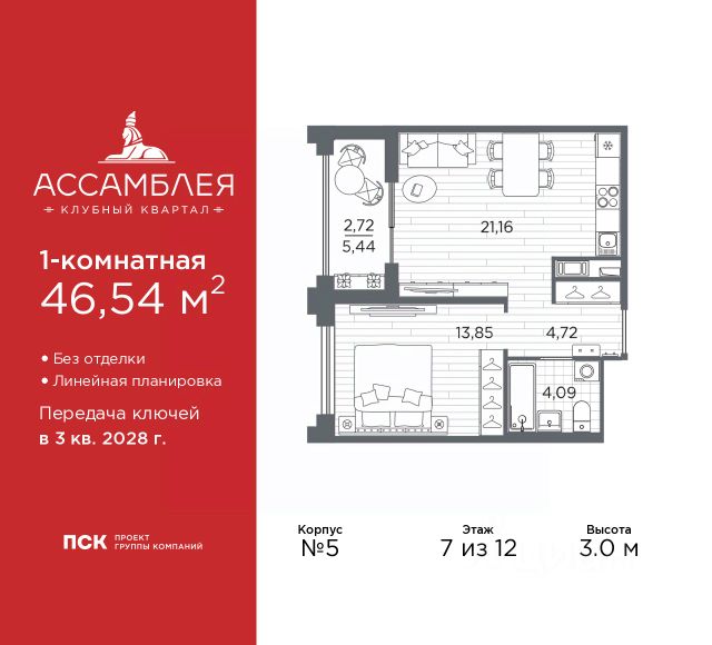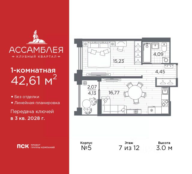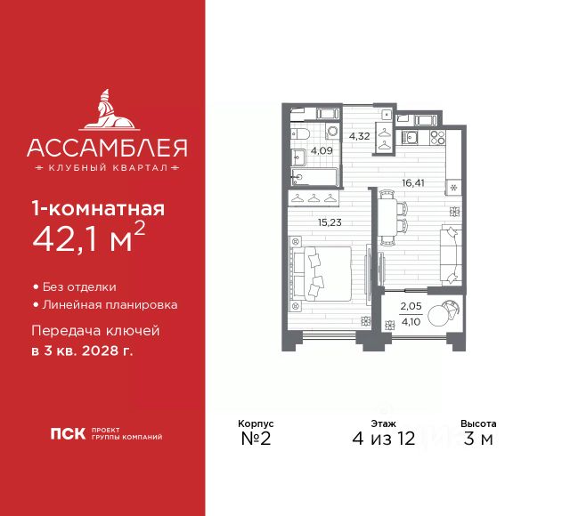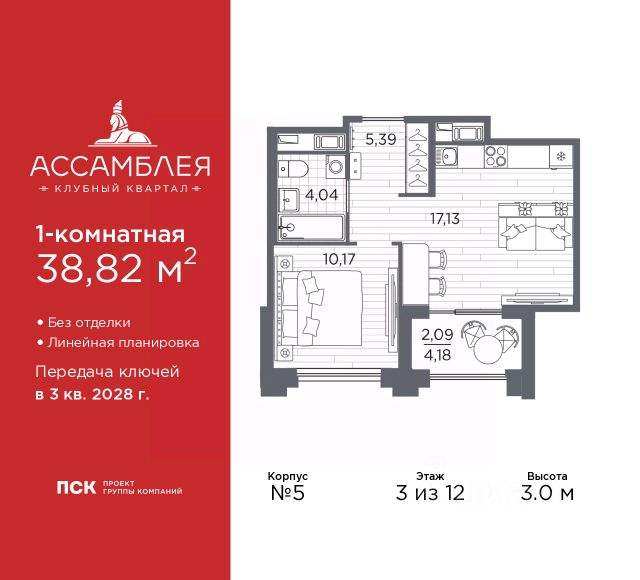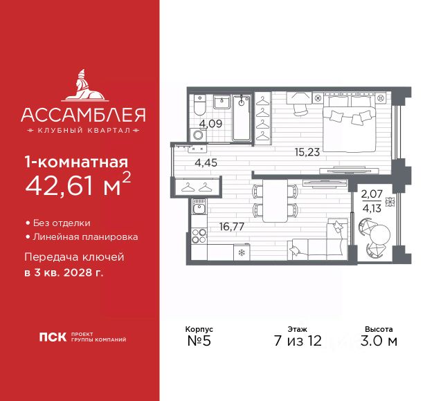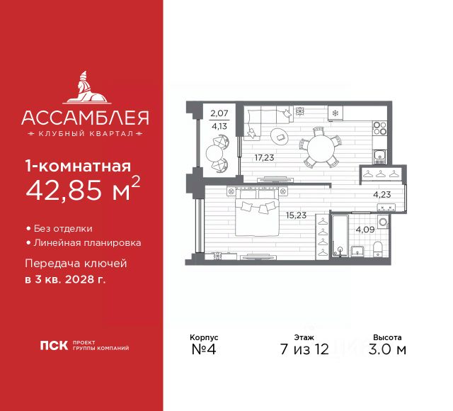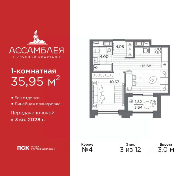 Продается 1-комн. квартира в Клубный квартал "Ассамблея" на 4 этаже. Квартира без отделки, полностью готова к чистовой отделке и дальнейшему ремонту. Общая площадь: 31.33 кв.м., жилая: 11.29 кв.м., площадь просторной кухни-столовой: 10.17 кв.м. Все окна выходят на одну сторону. В квартире один совмещенный санузел. Высота потолков 3.0 м. Дом монолитный, черырехподъездный, высотой 12 этажей. Квартира находится во 2-й секции в корпусе 5. На этаже 8 квартир. В подъезде 1 пассажирский и 1 грузовой лифт. Окончание строительства - 3 квартал 2028 года. Оформление сделки по договору долевого участия. В шаговой доступности от жилого комплекса находятся станции метро (расстояние по прямой): "Горный институт" (1.0 км), "Василеостровская" (1.4 км), "Приморская" (1.5 км), также недалеко от этого корпуса расположены станции метро: "Спортивная", "Чкаловская". "Клубный квартал Ассамблея" — проект бизнес-класса на Васильевском острове, в самом сердце исторического Петербурга. Комплекс состоит из пяти корпусов переменной этажности — от 7 до 12 этажей — с выразительной архитектурой в стиле неомодернизма: светлый клинкер, панорамное остекление, просторное лобби с потолками высотой почти 8 метров. Потолки — до 3,2 метров. Подземный паркинг на 667 машиномест. Комфорт и инфраструктура Проект ориентирован на комфортную городскую жизнь. В закрытом дворе — ландшафтное озеленение, современные детские и спортивные площадки. Внутренний клуб для резидентов включает коворкинг, переговорные, кинозал, фитнес и бьюти-зону. IP-домофония с просмотром камер видеонаблюдения, дистанционное открывание дверей и доступа на территорию и в парадную со смартфона и планшета, просмотр показаний счетчиков, приложение для жителей PSK Home. Локация Расположение на Васильевском острове — сильная сторона проекта. До четырех станций метро ("Горный институт", "Василеостровская", "Спортивная", "Приморская") — 515 минут пешком. В шаговой доступности — зелёные зоны, культурные учреждения, в том числе сад "Василеостровец" и ДК имени Кирова. Основные магистрали Большой, Средний и Малый проспекты, Наличная и Уральская улицы. Съезд на ЗСД расположен недалеко от станции метро "Приморская", близ береговой линии. Благовещенский и Дворцовый мосты соединяют остров с центром города, а мосты Тучков, Биржевой и Бетанкура — с Петроградской стороной. Застройщик Группа компаний ПСК является одной из ведущих девелоперских компаний Санкт Петербурга. На протяжении 18 лет она возводит в Северной столице качественное жилье премиум, бизнес и комфорт-класса, социальные объекты школы и детские сады, апарт-отели и торговые центры. Является шестикратным обладателем золотого знака "Надежный застройщик России". #2Mbg9M