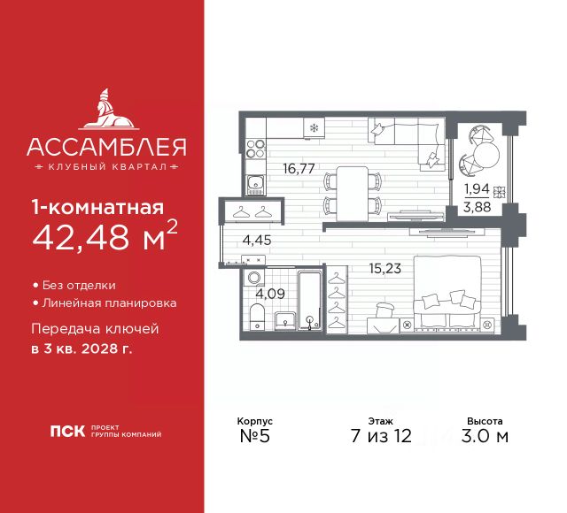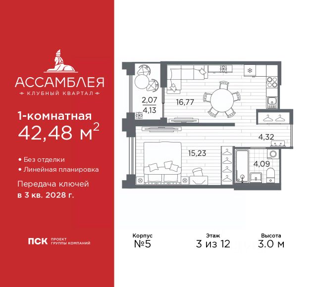 Продается 1-комн. квартира в Клубный квартал "Ассамблея" на 4 этаже. Квартира без отделки, полностью готова к чистовой отделке и дальнейшему ремонту. Общая площадь: 31.33 кв.м., жилая: 11.29 кв.м., площадь просторной кухни-столовой: 10.17 кв.м. Все окна выходят на одну сторону. В квартире один совмещенный санузел. Высота потолков 3.0 м. Дом монолитный, черырехподъездный, высотой 12 этажей. Квартира находится во 2-й секции в корпусе 5. На этаже 8 квартир. В подъезде 1 пассажирский и 1 грузовой лифт. Окончание строительства - 3 квартал 2028 года. Оформление сделки по договору долевого участия. В шаговой доступности от жилого комплекса находятся станции метро (расстояние по прямой): "Горный институт" (1.0 км), "Василеостровская" (1.4 км), "Приморская" (1.5 км), также недалеко от этого корпуса расположены станции метро: "Спортивная", "Чкаловская". "Клубный квартал Ассамблея" — проект бизнес-класса на Васильевском острове, в самом сердце исторического Петербурга. Комплекс состоит из пяти корпусов переменной этажности — от 7 до 12 этажей — с выразительной архитектурой в стиле неомодернизма: светлый клинкер, панорамное остекление, просторное лобби с потолками высотой почти 8 метров. Потолки — до 3,2 метров. Подземный паркинг на 667 машиномест. Комфорт и инфраструктура Проект ориентирован на комфортную городскую жизнь. В закрытом дворе — ландшафтное озеленение, современные детские и спортивные площадки. Внутренний клуб для резидентов включает коворкинг, переговорные, кинозал, фитнес и бьюти-зону. IP-домофония с просмотром камер видеонаблюдения, дистанционное открывание дверей и доступа на территорию и в парадную со смартфона и планшета, просмотр показаний счетчиков, приложение для жителей PSK Home. Локация Расположение на Васильевском острове — сильная сторона проекта. До четырех станций метро ("Горный институт", "Василеостровская", "Спортивная", "Приморская") — 515 минут пешком. В шаговой доступности — зелёные зоны, культурные учреждения, в том числе сад "Василеостровец" и ДК имени Кирова. Основные магистрали Большой, Средний и Малый проспекты, Наличная и Уральская улицы. Съезд на ЗСД расположен недалеко от станции метро "Приморская", близ береговой линии. Благовещенский и Дворцовый мосты соединяют остров с центром города, а мосты Тучков, Биржевой и Бетанкура — с Петроградской стороной. Застройщик Группа компаний ПСК является одной из ведущих девелоперских компаний Санкт Петербурга. На протяжении 18 лет она возводит в Северной столице качественное жилье премиум, бизнес и комфорт-класса, социальные объекты школы и детские сады, апарт-отели и торговые центры. Является шестикратным обладателем золотого знака "Надежный застройщик России". #2Mbg9M