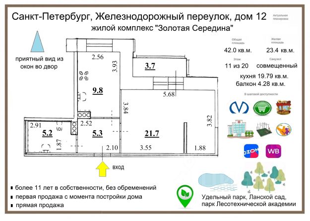 • Окна квартиры выходят на зелёную зону
