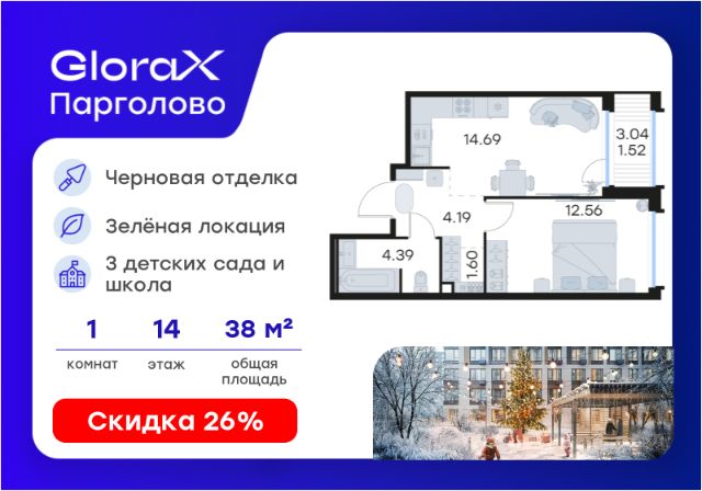 Продается 1-комн. квартира на 9-м этаже в проекте комфорт-класса GloraX Парголово. Общая площадь лота составляет 39,93 кв. м, из которых 10,32 кв. м отведено под жилую и 17,80 кв. м под кухонную зону. Номер квартиры - 79. Преимущества: - Квартира комфорт-класса - Зеленый район, Шуваловский парк в 20 мин. пешком - 10 мин. до КАД, 15 мин. до ЗСД - 5 эт. паркинг на 451 м/м - Закрытые дворы с видеонаблюдением - Детские площадки с геопласткой и бизиборадми - Сады и школы в шаговой доступности - Спортивные площадки и велодорожки - Собственный комьюнити-центр - Келлеры для хранения - Коммерческие помещения на 1 этажах GloraX Парголово — масштабный проект комфорт-класса в Выборгском районе Санкт-Петербурга. Место, продуманное до мелочей, где все, что необходимо — рядом. Архитектурно-пространственное решение отличается лаконичностью и строгостью и придает проекту свой характер. Внутренние дворы закрыты от внешнего мира, создавая приватную территорию для жителей. Живите на природе, но с комфортом мегаполиса. Десять минут на велосипеде или полчаса пешком — и вы окажетесь в одном из культовых мест отдыха петербуржцев: Шуваловском парке, Орловском заказнике с их чистыми карьерами или на Суздальских озерах. До ж/д станции "Парголово" 7 минут на автомобиле, до метро Проспект Просвещения 25 минут, КАД 10 минут, ЗСД 15 минут. В шаговой доступности остановка общественного транспорта. В шаговой доступности — собственные школы и детские сады. Здесь все создано для максимального комфорта каждого жителя. Приватное пространство внутреннего двора с беседками с розетками для работы и отдыха, зеленый двор с уютным многоуровневым освещением, детскими эко-площадками и спортивными workout создает неповторимую атмосферу, заряжающую энергией на новые свершения. Квартиры сдаются без отделки. Цена указана при 100% оплате или стандартной ипотеке. Узнайте подробности в Отделе продаж.