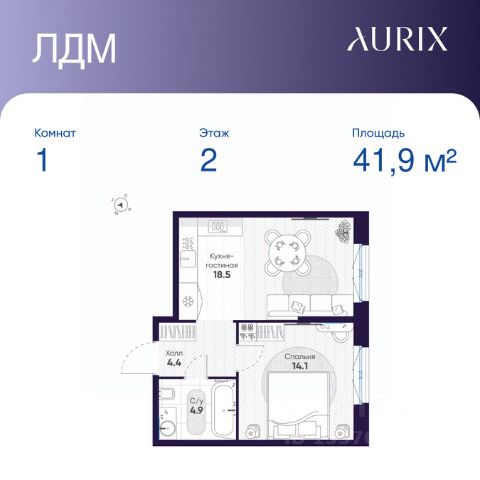 Продается 1-к квартира без отделки в ЖК "ЛДМ". Общая площадь квартиры — 41.9 кв. м, этаж 2 из 9. Тип дома — монолитный. Цена указана при 100% оплате.