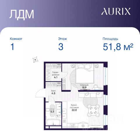 Продается 1-к квартира без отделки в ЖК "ЛДМ". Общая площадь квартиры — 51.8 кв. м, этаж 3 из 9. Тип дома — монолитный. Цена указана при 100% оплате.