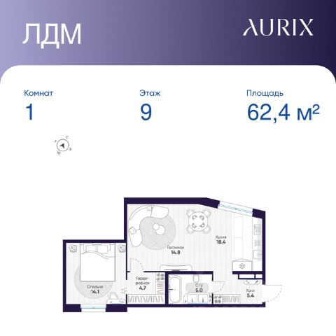 Продается 1-к квартира без отделки в ЖК "ЛДМ". Общая площадь квартиры — 62.4 кв. м, этаж 9 из 9. Тип дома — монолитный. Цена указана при 100% оплате.