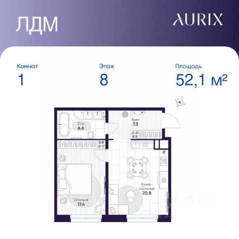 Продается 1-к квартира без отделки в ЖК "ЛДМ". Общая площадь квартиры — 52.1 кв. м, этаж 8 из 8. Тип дома — монолитный. Цена указана при 100% оплате.