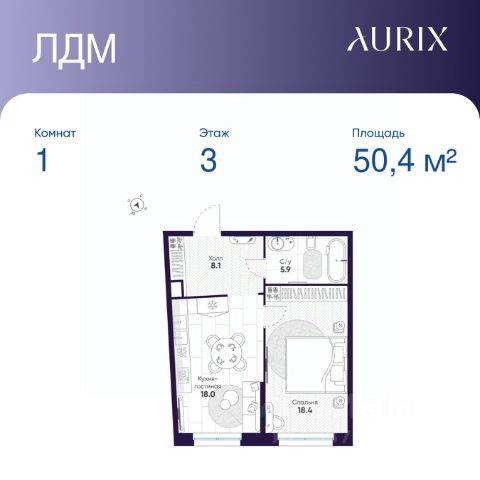 Продается 1-к квартира без отделки в ЖК "ЛДМ". Общая площадь квартиры — 50.4 кв. м, этаж 3 из 8. Тип дома — монолитный. Цена указана при 100% оплате.