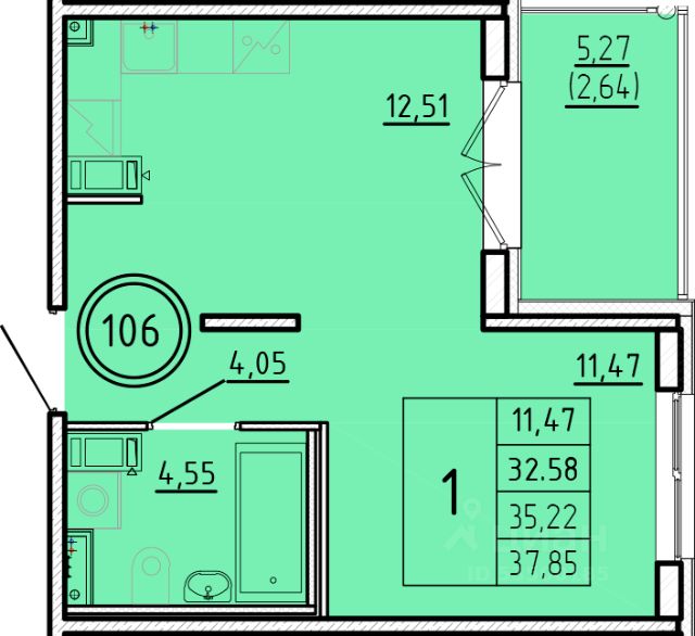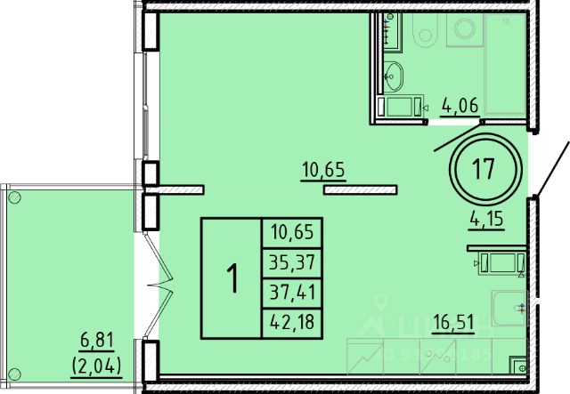 Продаётся 1-комнатная квартира в строящемся доме (Дом 1), срок сдачи: III-кв. 2026, общей площадью 35.37 кв.м., на 2 этаже.