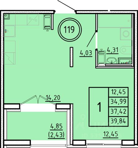 Продаётся 1-комнатная квартира в строящемся доме (Дом 1), срок сдачи: III-кв. 2026, общей площадью 39.25 кв.м., на 4 этаже.