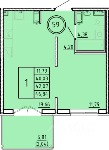 Продаётся 1-комнатная квартира в строящемся доме (Дом 3), срок сдачи: III-кв. 2026, общей площадью 41.18 кв.м., на 4 этаже.