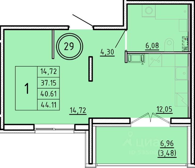 Продаётся 1-комнатная квартира в строящемся доме (Дом 1), срок сдачи: III-кв. 2026, общей площадью 34.99 кв.м., на 3 этаже.